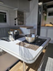 La cucina è dotata di 3 ripiani in bambù, uno dei quali rimovibile per poter cucinare all'aperto o semplicemente godersi una birra all'aperto, mobili contenitori, lavello con rubinetto estensibile (raggiunge all'esterno), frigorifero da 96 litri con congelatore, gas da campeggio portatile, riscaldamento istantaneo, ecc.