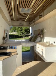 It is a large volume camper van, carefully equipped and with a minimalist design. The cabin is connected to the living area, creating a super spacious space by rotating the seats.