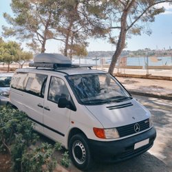 The vehicle is a Mercedes Vito van. The cabin is spacious and has a sofa bed, which provides plenty of comfort and sleeping space.